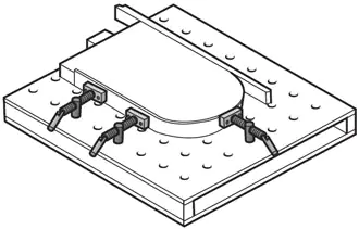 Des pièces rondes, ainsi que tous les types de pièces avec des formes irrégulières peuvent être maintenues sans problème avec les pinces de serrage Veritas. Ici, sur le schéma, elles sont combinées avec les crochets de banc ronds de VERITAS. Dans l'agencement des trous sur cette plaque de rabot, vous pouvez voir un bon exemple de la façon dont les possibilités d'un banc de rabot conventionnel peuvent être étendues.