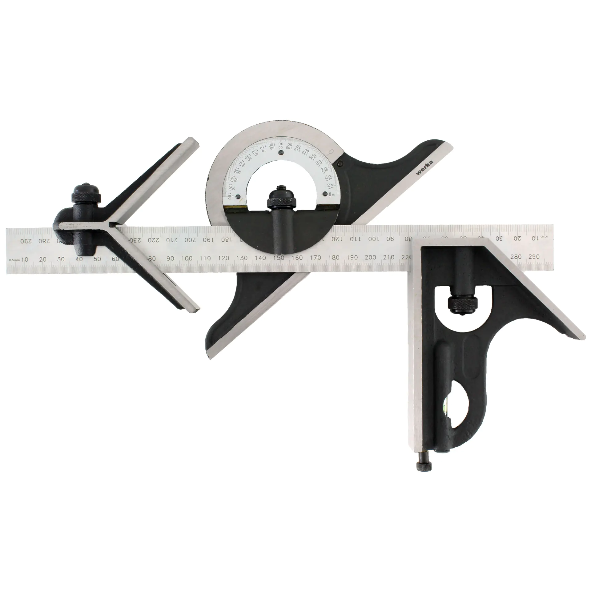 Souvent, un petit niveau à bulle est intégré, ainsi qu’une pointe à tracer. L'équerre combinée est idéale pour vérifier et tracer des angles droits et obliques, pour transférer des mesures, pour mesurer des profondeurs ainsi que pour tracer des lignes parallèles.
