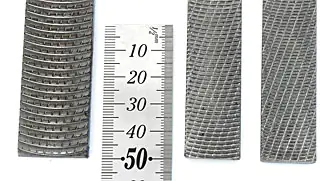 Comparaison des râpes à sculpter, à gauche grossière, au milieu fine, à droite extra-fine. L'espacement des dents des râpes à sculpter grossières est d'environ 3 mm, celui des râpes fines d'environ 1,6 mm, et celui des râpes extra-fines d'environ 1,2 mm.