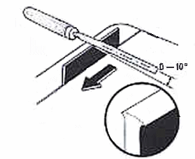 A. On place la lame sur l'établi, de sorte que le côté avec le fil à tirer dépasse et on la maintient fermement avec la main gauche. Dans la main droite, avec la poignée vers le bas (acier en haut), on tient l'acier à lame à dégrossir et on commence à tirer l'acier vers soi en appuyant à l'extrémité éloignée de la lame. Placez la pointe de l'acier à cette extrémité éloignée et, tout en tirant, vous montez toujours avec l'acier. Restez autant que possible à angle droit par rapport au bord de la lame ! De cette manière, vous passez en biais sur le bord de la lame à dégrossir et empêchez la formation de rayures dans l'acier à lame à dégrossir. Vous pouvez répéter ce tirage - mais toujours dans la même direction. Pour un fil plus grossier, il vous suffit d'incliner légèrement l'acier à lame à dégrossir, de sorte que vous soyez légèrement en dessous de 90°.
