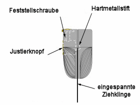 Dans le schéma à droite, vous voyez une coupe transversale. L'affûteur de lames à tirer est glissé sur la lame à tirer, qui est maintenue verticalement dans un étau ou sur un établi. La ligne en pointillés blancs indique l'intérieur de cet appareil. Un stylo en carbure a pour fonction d'attirer le fil. À gauche, vous pouvez sélectionner l'angle souhaité pour le fil à l'aide du bouton de réglage. Une fois l'angle choisi, l'angle réglé est fixé avec la vis de blocage, puis l'affûteur est passé une ou plusieurs fois sur la lame à tirer jusqu'à ce que le fil souhaité soit atteint. Avec cet appareil, vous avez un guidage sûr et fiable. Il est disponible sur notre page dédiée aux lames à tirer.