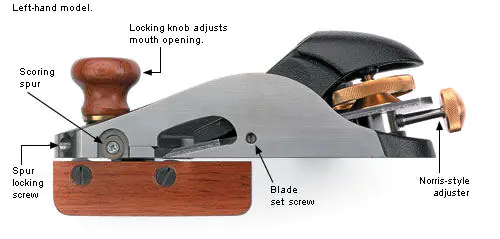 La lame est biseautée à 15°, ce qui lui permet de pénétrer plus doucement dans le bois, car elle n'est pas immédiatement confrontée à toute la largeur de la coupe. Cela se remarque particulièrement avec le bois de bout. Comme ce rabot est ouvert d'un côté comme un rabot à feuillure, le bord de coupe s'aligne exactement avec la joue du rabot, permettant ainsi de réaliser des feuillures très propres. Avec la vis de réglage à l'arrière, à la fois l'alimentation de la lame et le positionnement latéral sont facilement et précisément ajustés. 3 petites vis dans les joues à la hauteur de la lame maintiennent la lame en position souhaitée et empêchent tout déplacement pendant le travail. Un pré-coupeur devant la lame empêche les éclats dans le bois difficile ou lorsque l'on doit raboter contre le fil du bois. Ce pré-coupeur peut être réglé en profondeur et en largeur ou complètement retiré, par exemple, lorsqu'on rabote avec le fil du bois ou à plat.