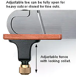 La construction de butée avec mâchoire de butée en bubinga (89 mm de long et 8 mm d'épaisseur) peut être réglée finement à l'aide de la vis moletée en laiton.